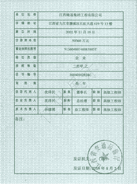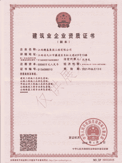 江西贛基集團工程有限公司是國家壹級施工總承包企業,具有公路工程、市政公用工程、房屋建筑工程總承包壹級資質;公路路基、路面專業壹級;水利水電工程、電力工程、城市園林綠化、公路養護工程貳級資質。